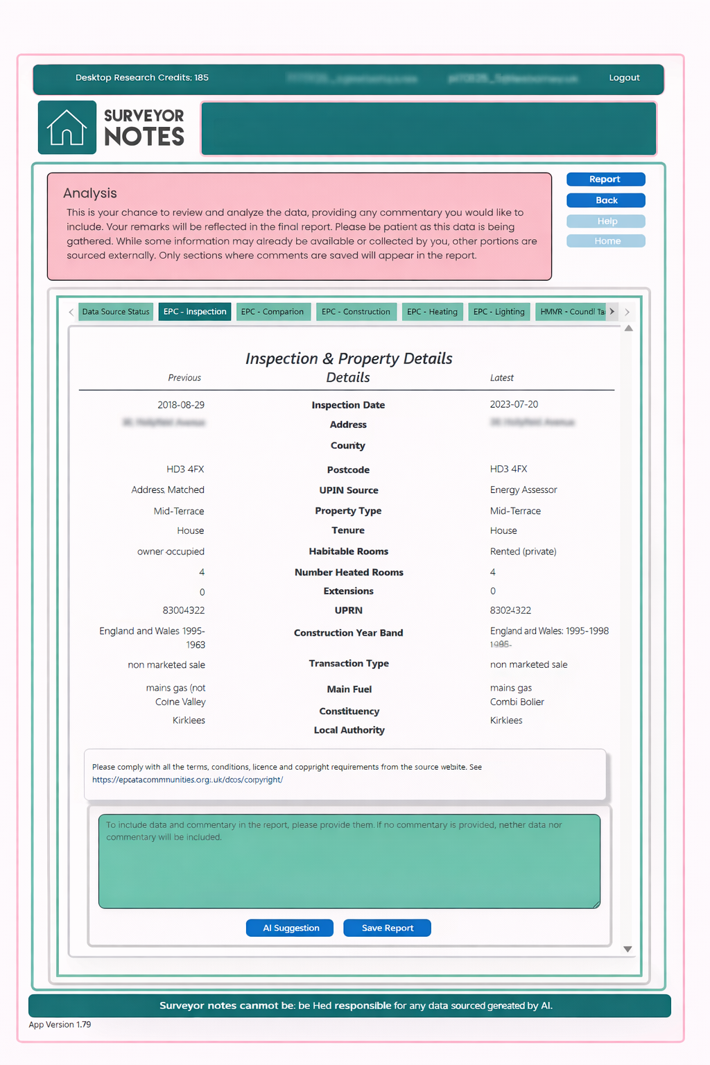 Please ensure compliance with all terms, conditions, licensing, and copyright requirements of the EPC data source. Surveyor Notes presents EPC information for professional reference and analysis only.