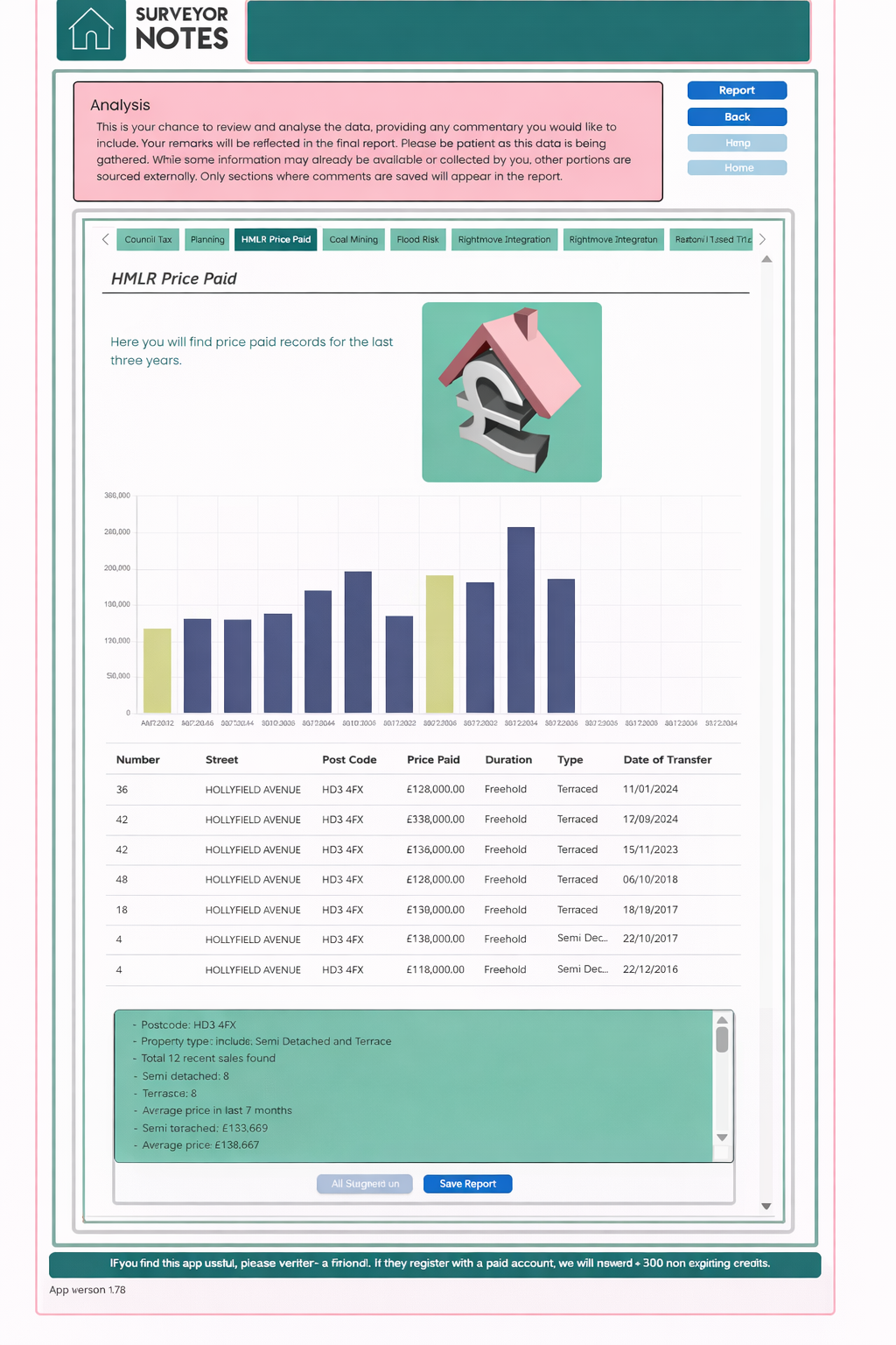 The Analysis screen presents price paid data for the surrounding area, typically covering recent years. Information is displayed using:
