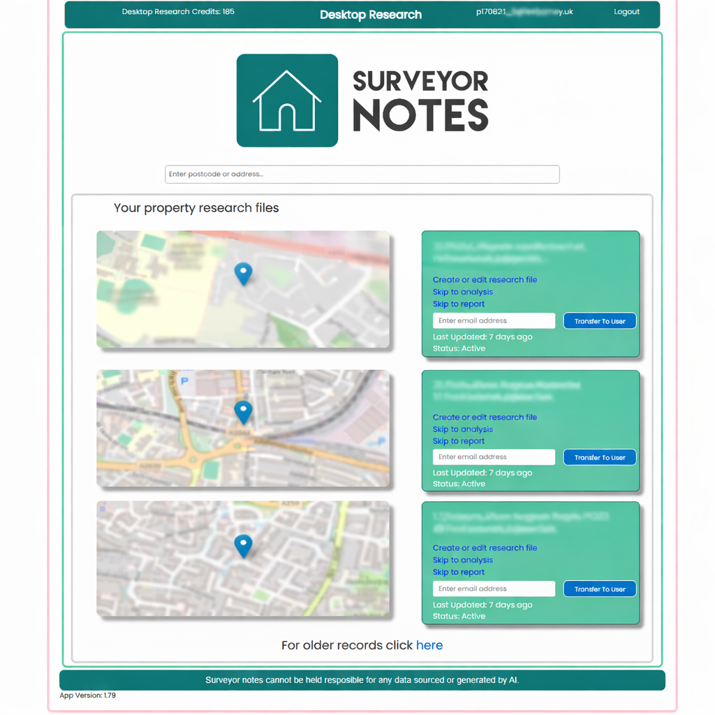 This screen is the starting point for Desktop Research in Surveyor Notes. It allows you to search for properties, create new research files, and access existing research records.